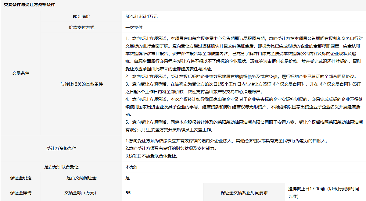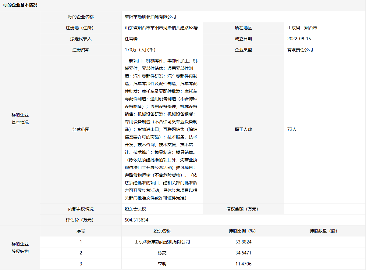 萊陽萊動(dòng)油泵油嘴有限公司53.8824%股權(quán)